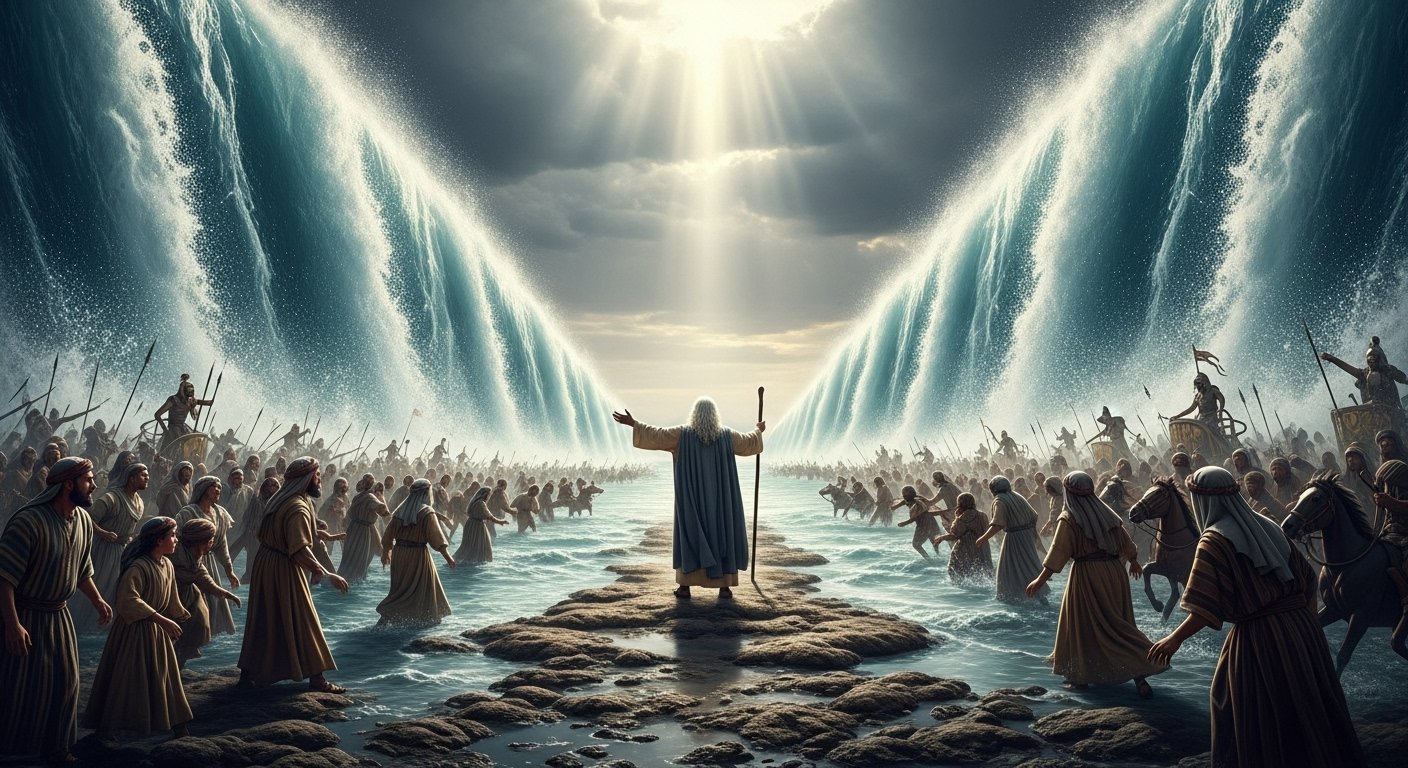 Mas Moisés responde com uma das declarações mais poderosas da Bíblia: “Não temais; estai quietos e vede o livramento do Senhor… O Senhor pelejará por vós, e vos calareis.” Deus ordena que Moisés estenda sua vara sobre o mar. Durante a noite, um forte vento oriental divide as águas, criando um caminho seco. A coluna de nuvem se move para trás de Israel, criando trevas para os egípcios, mas luz para os israelitas.